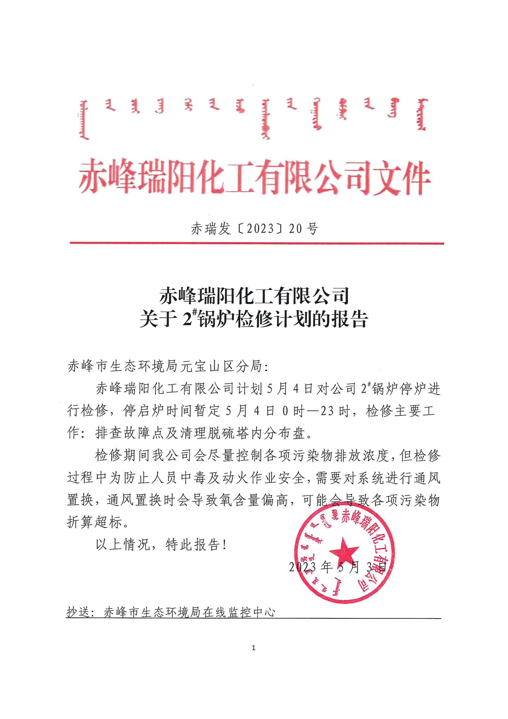 赤峰瑞陽化工有限公司2#鍋爐計劃檢修報告